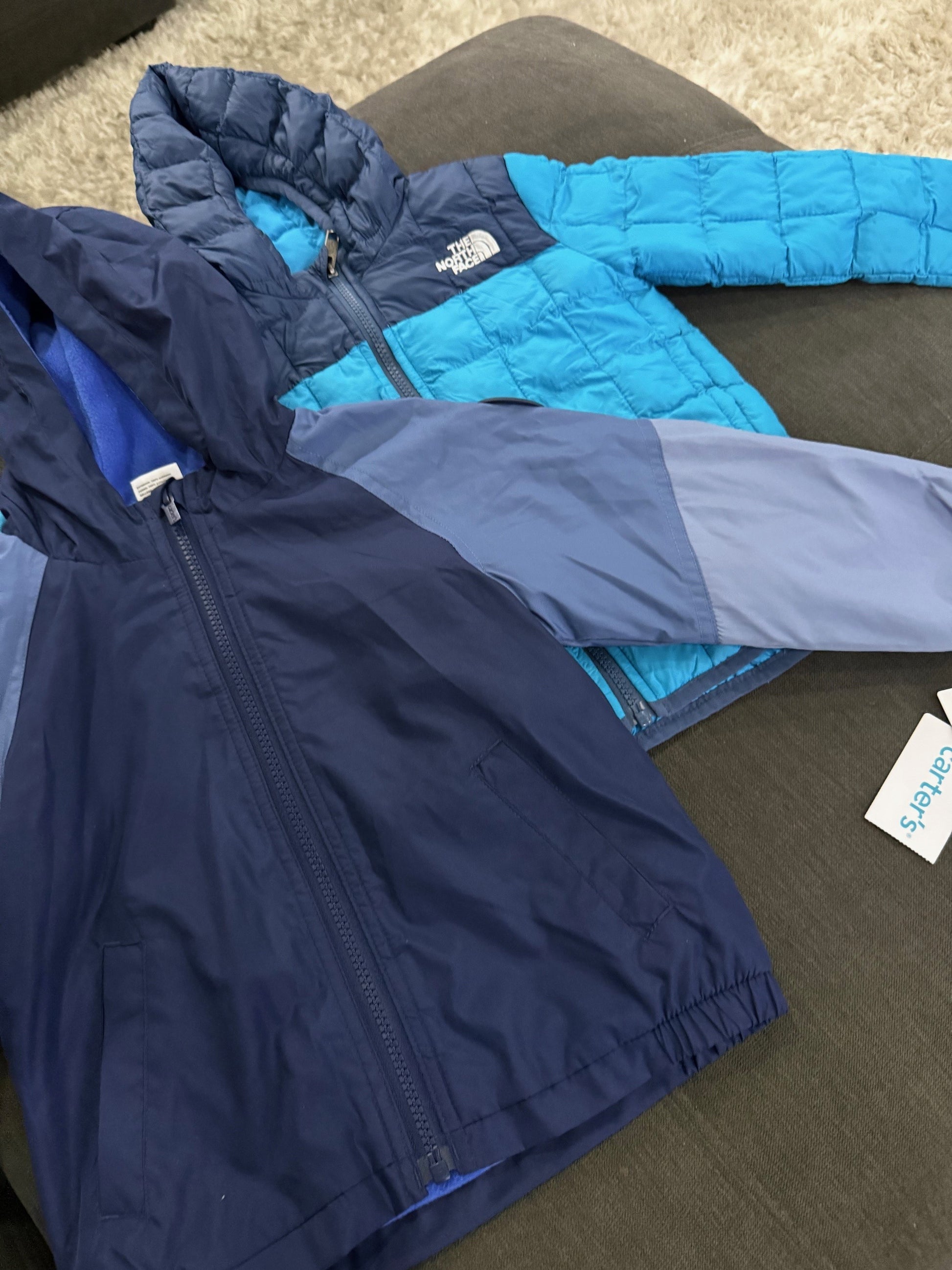 Chamarra marca North Face (usada) y chamarra Carter's (nueva, con etiqueta e impermeable), color azul marino, talla 3.