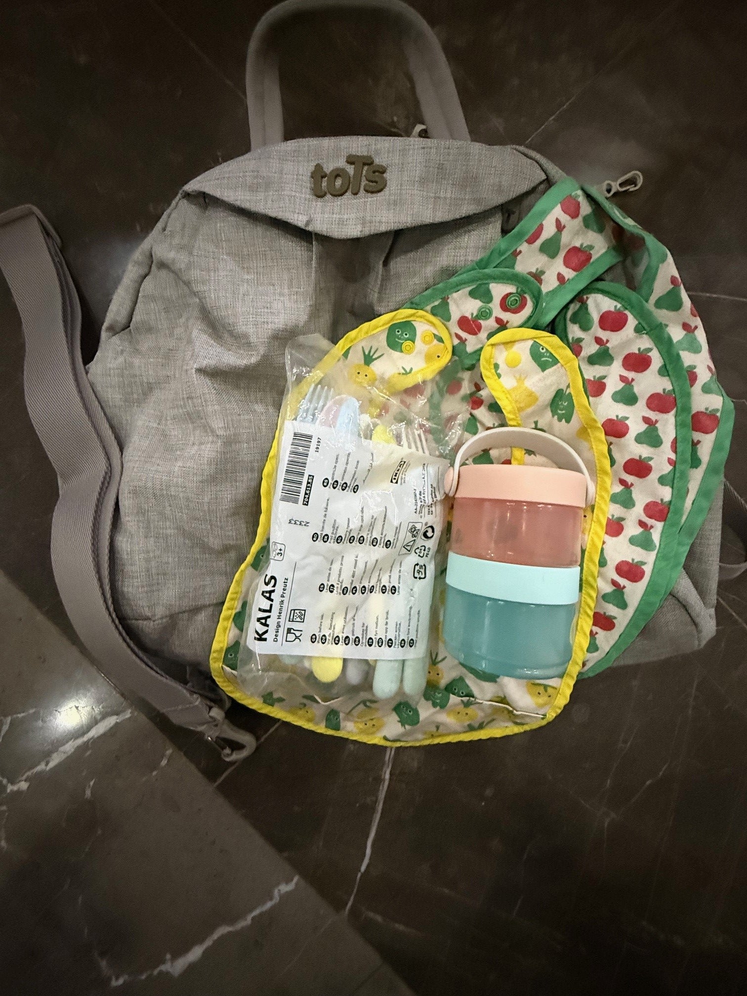 Pañalera marca TOTS, color gris. Con 3 baberos lavables en lavadora, cubiertos de plástico marca Kalas (IKEA) y dispensadores ideales para fórmula o snacks.